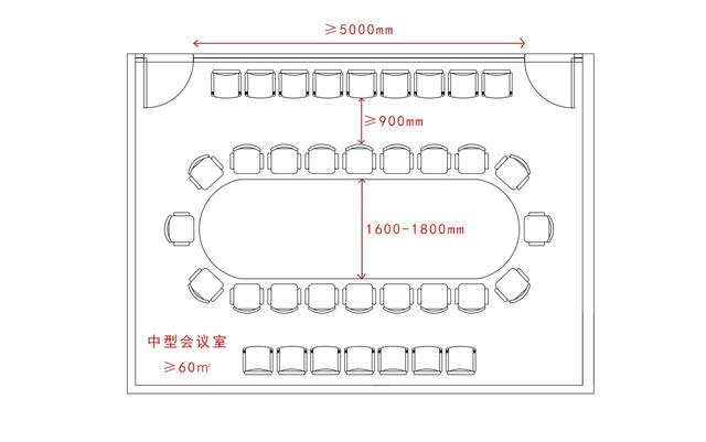 6.4.4 中型會議室面積不宜小于60㎡、可供15~50人會議;中型會議室的會議桌桌面尺寸為1.6m~1.8m;桌子高度0.75m~0.8m;如該辦公室位于高層建筑的內(nèi),依據(jù)《高層民用建筑設(shè)計防火規(guī)范》規(guī)定,達(dá)到60平方的獨(dú)立開間需設(shè)計兩個以上的安全疏散出口,其相鄰兩個安全出口最近邊緣的水平距離不應(yīng)小于5m。