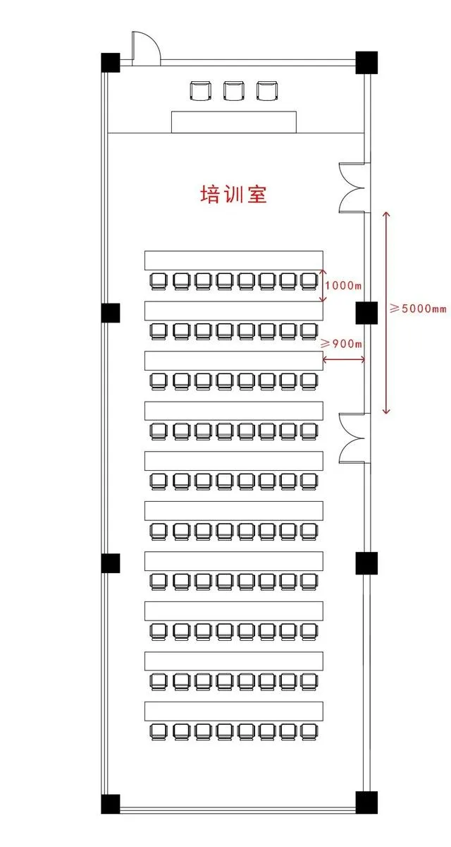6.4.5 培訓(xùn)室前后桌子的距離應(yīng)不小于0.9m~1m;椅子與墻面的中間過道不應(yīng)少0.9m。培訓(xùn)桌桌面寬度為0.4m~0.6m ,桌子高度為0.7m~0.8。依據(jù)建筑設(shè)計防火規(guī)范規(guī)定,達(dá)到60平方的獨(dú)立開間需設(shè)計兩個以上的安全疏散出口,其相鄰兩個安全出口最近邊緣的水平距離不應(yīng)小于5m。超60平方的培訓(xùn)室墻面飾面應(yīng)設(shè)計吸音板材。